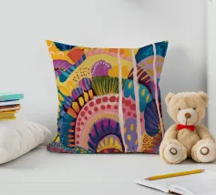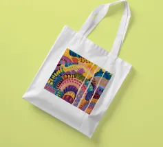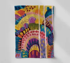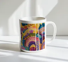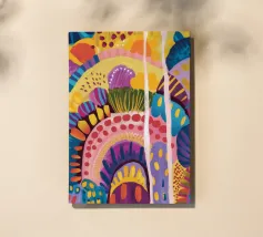 Un paesaggio astratto stravagante e colorato, caratterizzato da dolci colline e forme stilizzate in un arcobaleno di tonalità. Le linee fluide e la tavolozza vibrante creano un senso di gioia immaginativa e armonia naturale.
