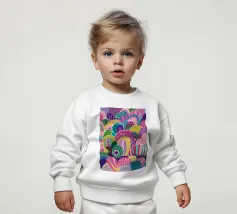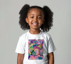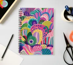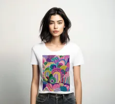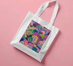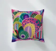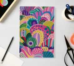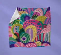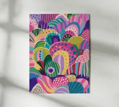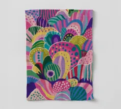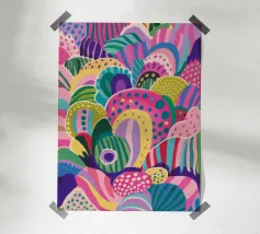 Un paesaggio stravagante composto da colline ondulate ed elementi floreali stilizzati in rosa, viola e verde vivaci. Le forme giocose e i colori allegri creano una scena fantasiosa e gioiosa.
