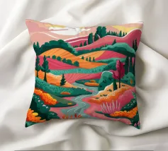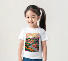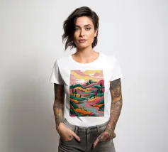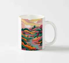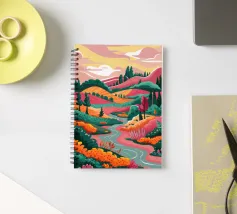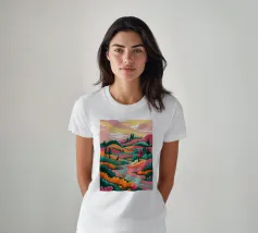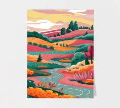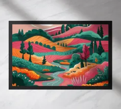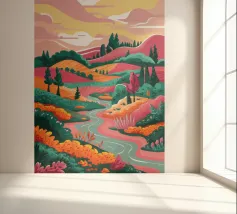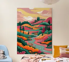 Un paesaggio panoramico delle dolci colline toscane, con strade tortuose, cipressi e campi resi con una tavolozza di colori ricchi e caldi che cattura la bellezza della campagna italiana.