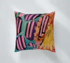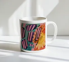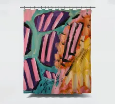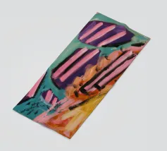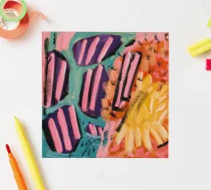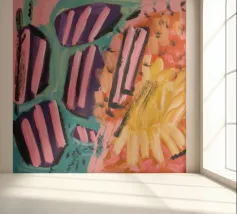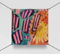 Un'opera d'arte astratta che presenta audaci strisce diagonali simili a caramelle nei colori rosa, nero e bianco, giustapposte a zone di giallo, arancione e viola strutturato, suggerendo una dinamica e dolce collisione di forme e colori.