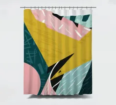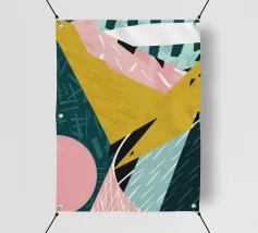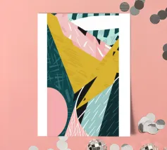 Un'opera d'arte astratta caratterizzata da una collisione dinamica di forme nei toni del giallo, del verde e del nero. Gli angoli acuti e le forme sovrapposte creano un senso di movimento energico e di modernità.