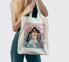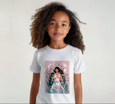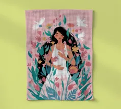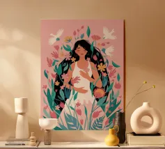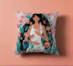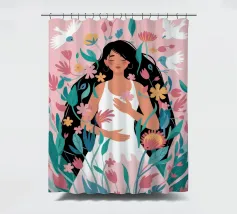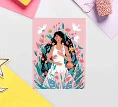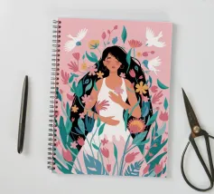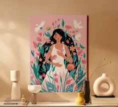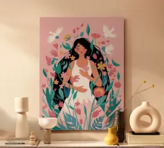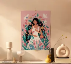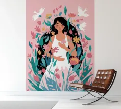 Una bella illustrazione di una donna dai lunghi capelli scuri, con gli occhi chiusi, circondata da una rigogliosa cornice di fiori rosa e colombe bianche, che simboleggiano pace e bellezza.