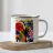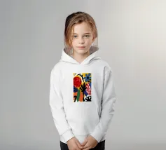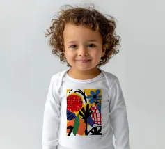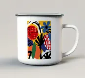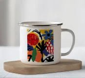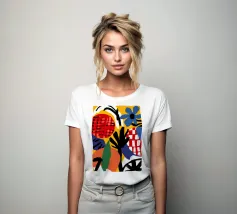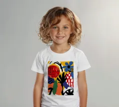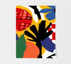Una natura morta floreale audace ed energica è decostruita in colori primari e forme grafiche, con fiori rossi, blu e gialli che esplodono da un vaso in una composizione potente e astratta.