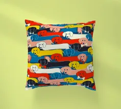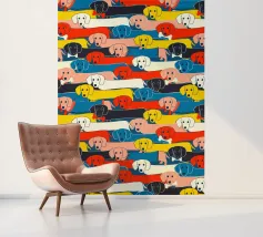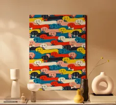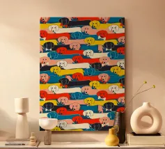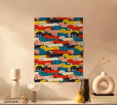 Un disegno di bassotto giocoso e vivace, con adorabili salsicciotti di vari colori e accessori, che si estendono su uno sfondo audace. Questa affascinante illustrazione è perfetta per gli amanti dei cani, per i proprietari di bassotti e per tutti coloro che amano i disegni stravaganti di animali domestici. Ideale per tessuti, decorazioni per la casa, abbigliamento per bambini e accessori. Una stampa divertente ed elegante che aggiunge personalità e allegria a qualsiasi spazio! Creato da showmemars
