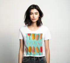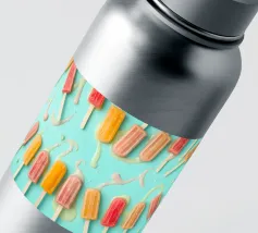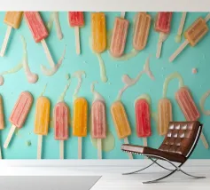 I frozen pops dai colori vivaci sono disposti su uno sfondo blu, con alcuni succhi che si sciolgono e si raccolgono intorno a loro, mostrando una varietà di sapori fruttati perfetti per l'estate.