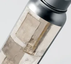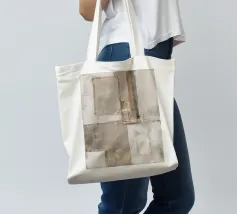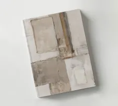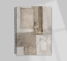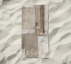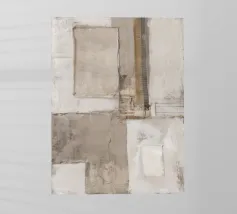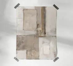 Questo disegno astratto combina elementi industriali con colori terrosi e forme minimaliste. Le texture stratificate di carta e materiali da costruzione, combinate con pennellate, creano un'affascinante profondità e riflettono lo stile boho del design contemporaneo.