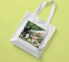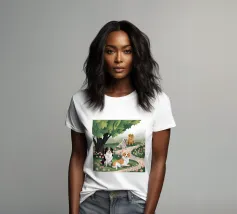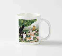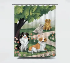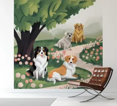 Tre cani riposano tranquillamente su un sentiero del giardino incorniciato da fiori e alberi. La composizione serena evidenzia un momento di pace e di cameratismo naturale.