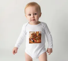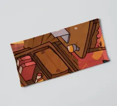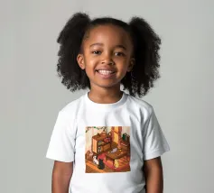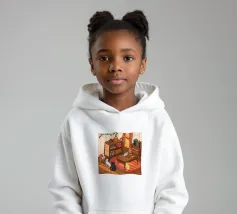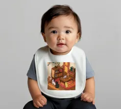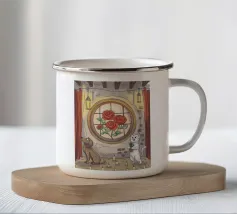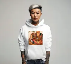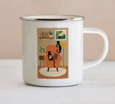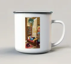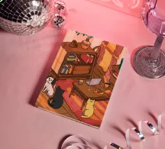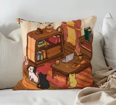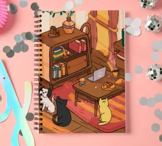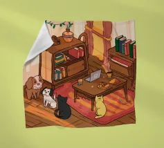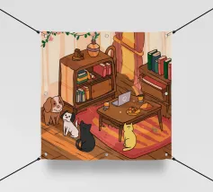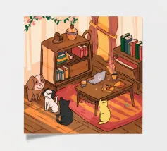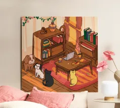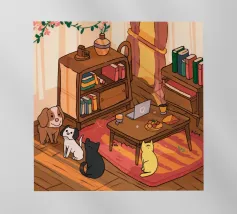 Questo dipinto mostra un accogliente salotto con una libreria in legno e un camino. Quattro animali, due cani e due gatti, godono di comfort moderni, tra cui un computer portatile, in una calda estetica rustica.