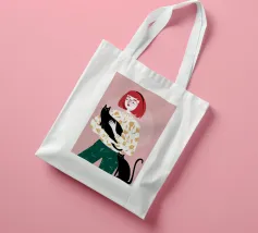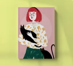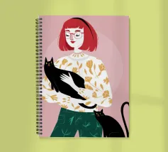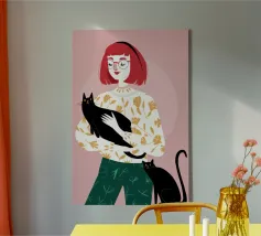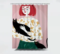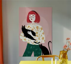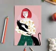 Una donna con i capelli rossi corti e un maglione a fantasia tiene in braccio un elegante gatto nero. L'espressione dolce di lei e la postura rilassata del gatto mostrano un legame stretto e confortante.