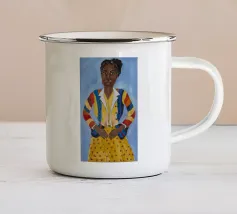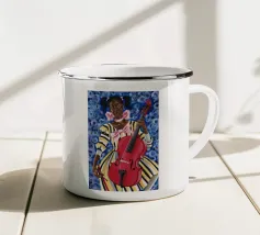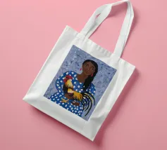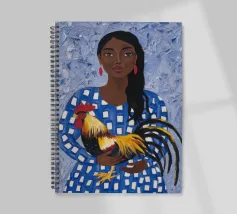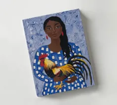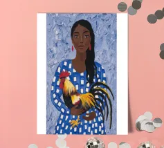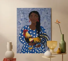 Il dipinto raffigura una persona con un abito a scacchi blu, che tiene in mano un gallo. Lo sfondo è di un blu strutturato che mette in risalto l'interazione gioiosa tra la persona e il gallo.