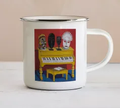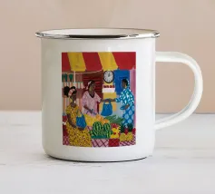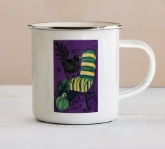 Il dipinto raffigura una persona con un abito a scacchi blu, che tiene in mano un gallo. Lo sfondo è di un blu strutturato che mette in risalto l'interazione gioiosa tra la persona e il gallo.