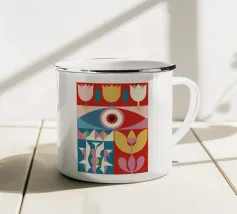 Una composizione con forme geometriche audaci e colori vivaci forma un mosaico astratto. Elementi come cerchi, triangoli e una balena blu creano un intrigante equilibrio visivo all'interno del layout rettangolare.