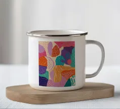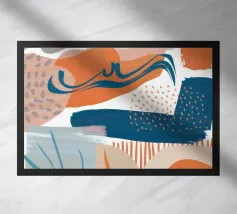 Una moderna composizione astratta con archi color terracotta, forme blu strutturate e linee organiche. L'opera d'arte fonde l'estetica bohémien con elementi minimalisti e astratti per un pezzo equilibrato e di tendenza.