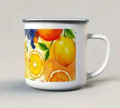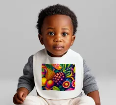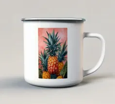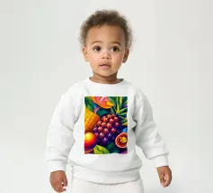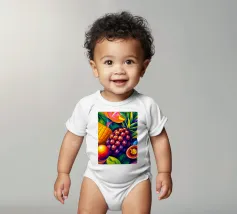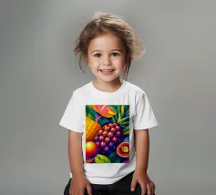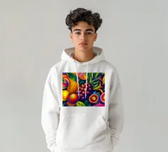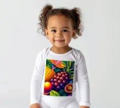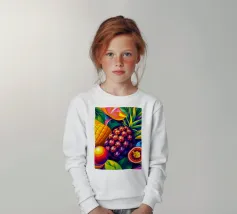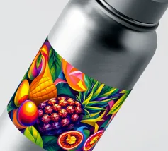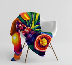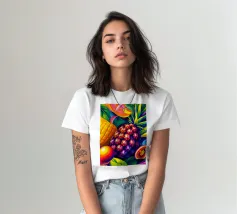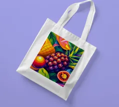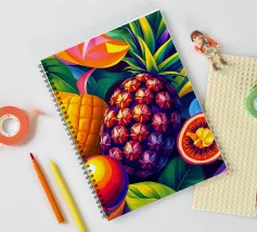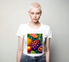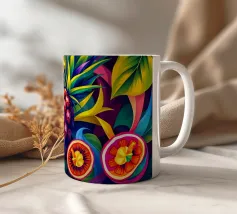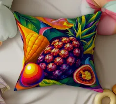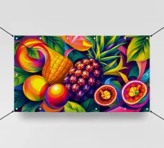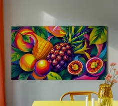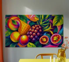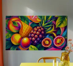 Una composizione accattivante presenta un medley di frutti tropicali come ananas, frutto della passione e mango su uno sfondo astratto e colorato pieno di forme e foglie vorticose.