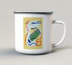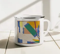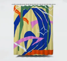 Forme astratte e colori vivaci interagiscono su uno sfondo beige, con forme ondulate blu, verdi e rosse che si intrecciano con accenti rosa e bianchi. La composizione suggerisce movimento dinamico e complessità.