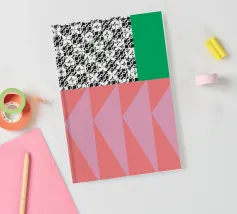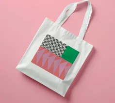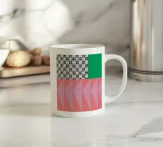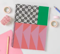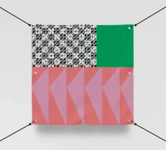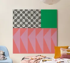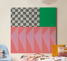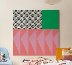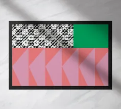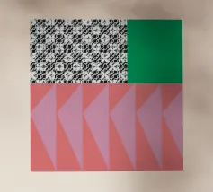 Un disegno geometrico presenta un complesso motivo in bianco e nero accanto a un blocco solido verde in alto, contrastato da un motivo angolare rosa ripetuto in basso. Le sezioni contrastanti creano un'esperienza visiva dinamica con linee e forme decise.