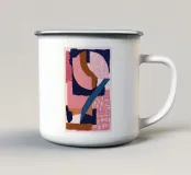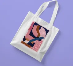Una composizione astratta audace e moderna presenta una disposizione dinamica di forme sovrapposte in rosa, blu navy e nero, con dettagli strutturati che creano un pezzo sofisticato e grafico.