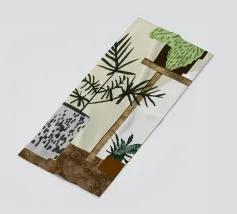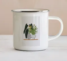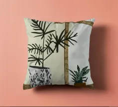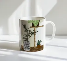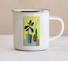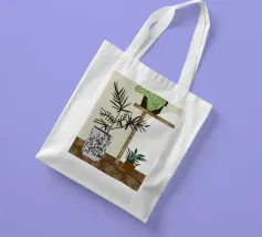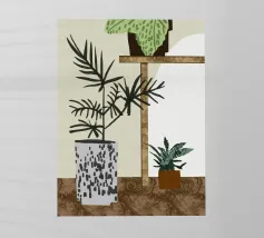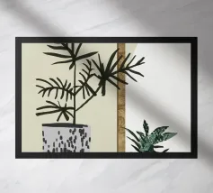 Una rappresentazione grafica di piante d'appartamento in vaso viene visualizzata su uno sfondo bicolore. Una pianta alta in un vaso stilizzato si trova accanto a uno scaffale che ospita una pianta in vaso più piccola, creando una scena calma e organizzata.