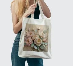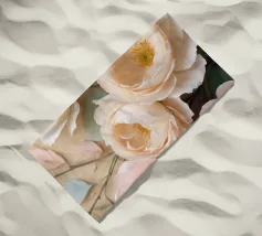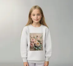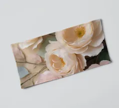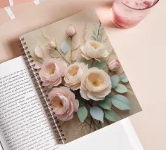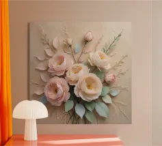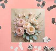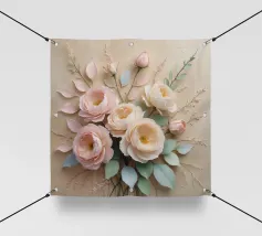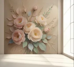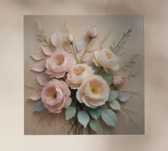 Una splendida composizione floreale mette in mostra delicate rose e foglie color pastello, disposte artisticamente su uno sfondo morbido e neutro. La composizione mette in risalto l'eleganza e la maestria.