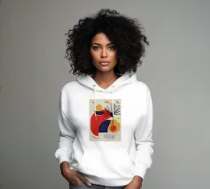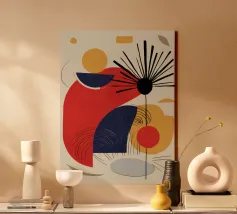 Una composizione astratta audace e grafica presenta un sole rosso brillante, linee nere dinamiche e forme geometriche, creando un pezzo potente e moderno con un forte senso di design ed energia.