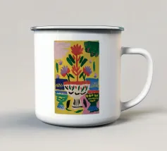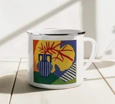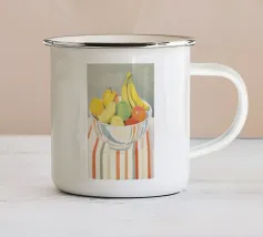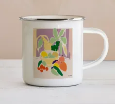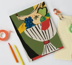 Una moderna natura morta di ispirazione cubista di una composta di frutta con uva e pere. Le forme decostruite, le strisce decise e le forme geometriche creano un'interpretazione sofisticata e artistica di un soggetto classico.