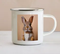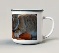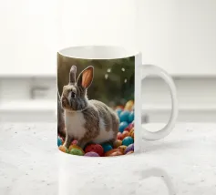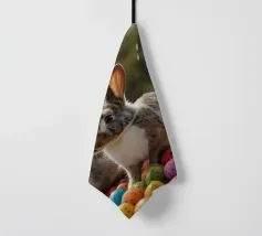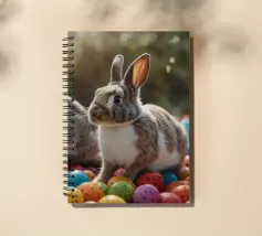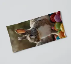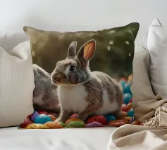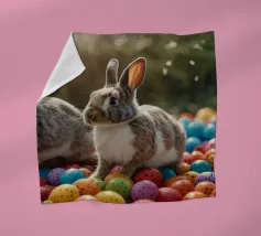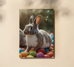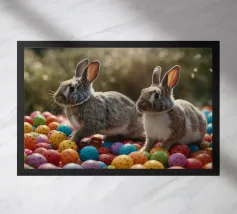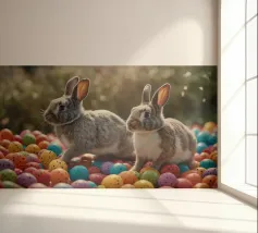 Due conigli saltano in mezzo a una moltitudine di uova luminose e maculate in un ambiente esterno, catturando lo spirito giocoso dei festeggiamenti primaverili sotto la tenue luce del giorno.