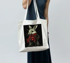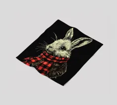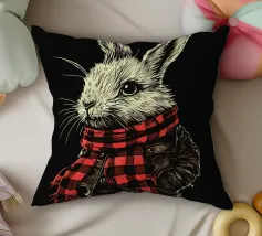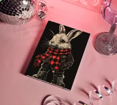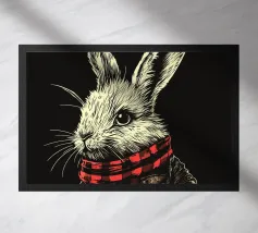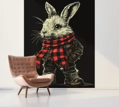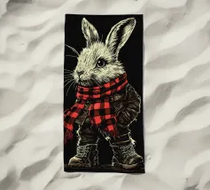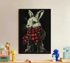 Un coniglio in piedi indossa una giacca di pelle e una sciarpa a scacchi rossi e neri. L'abbigliamento conferisce all'animale un aspetto urbano e sicuro di sé. Un'insolita miscela di carineria e attitudine rock.