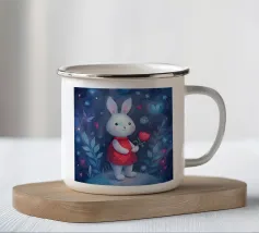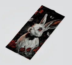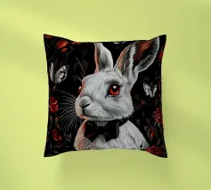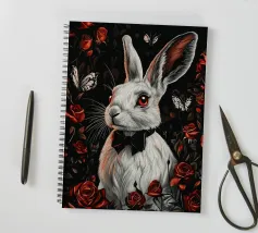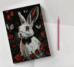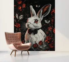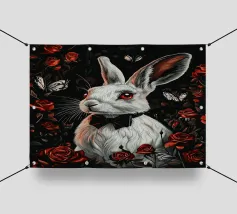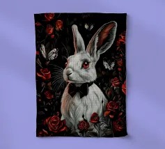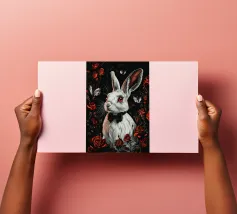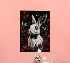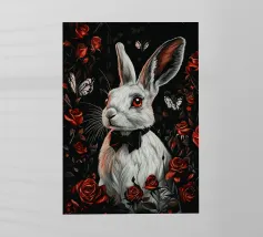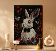 Questa opera d'arte oscura ma elegante mostra un coniglio bianco con intensi occhi rossi, circondato da rose rosse e farfalle svolazzanti. Il suo collare nero con fiocco rafforza l'effetto surreale e leggermente mistico dell'immagine. La combinazione di colori contrastanti e di dettagli finemente lavorati rende questo motivo particolarmente suggestivo. Ideale per gli amanti dell'arte dark, dell'arte animale surreale e dei motivi naturalistici d'atmosfera, che cercano un'insolita attrazione.