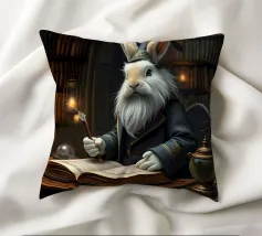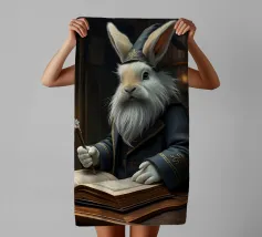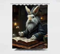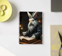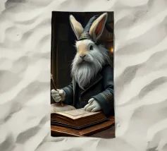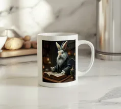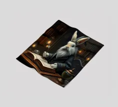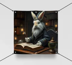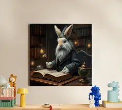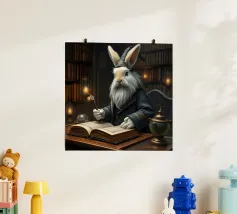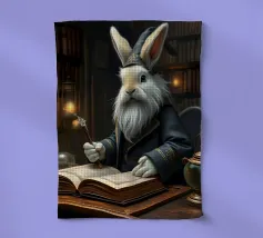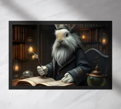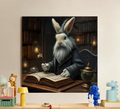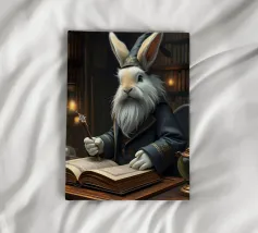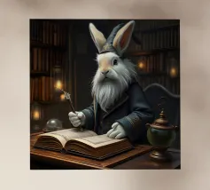 Questa incantevole immagine raffigura un maestoso coniglietto, vestito da mago, circondato da antichi tomi e da una luce calda e soffusa, in uno stile che ricorda l'arte fantasy fotorealistica con dettagli intricati e un tocco di fantasia.
