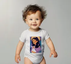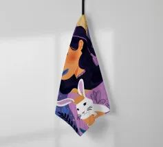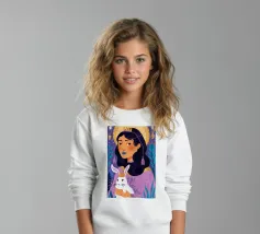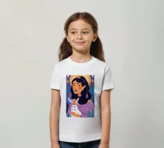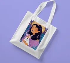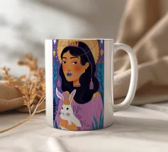 Questa opera d'arte raffigura una figura che tiene in mano un coniglio bianco, su uno sfondo mistico dai toni viola e oro. La figura è ornata da una corona e circondata da elementi floreali.