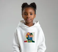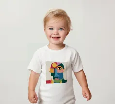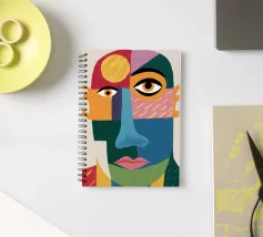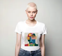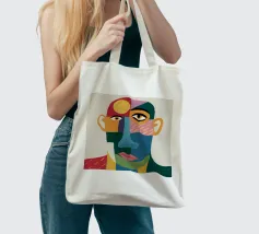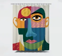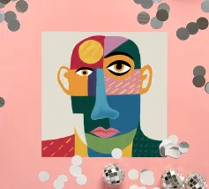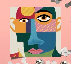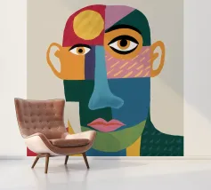 Un sorprendente ritratto astratto in stile cubista, con un volto composto da audaci forme geometriche e una tavolozza di colori vibranti e contrastanti di blu, verde e giallo.