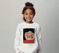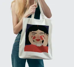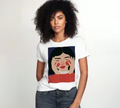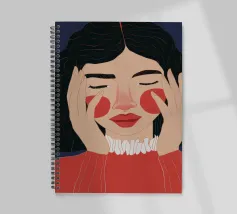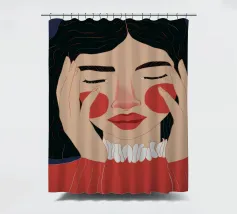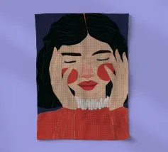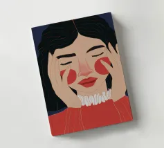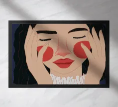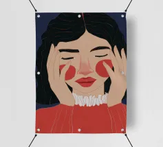 Un ritratto espressivo di una donna con un maglione rosso, che porta le mani sulle guance arrossate. I suoi occhi sono chiusi e trasmettono una forte emozione, che si tratti di timidezza, di amore o di essere sopraffatti, in modo toccante e comprensibile.