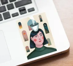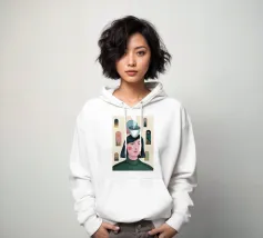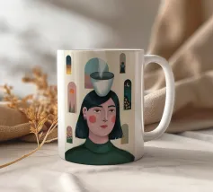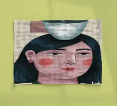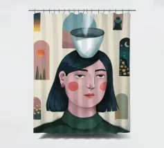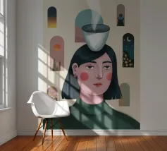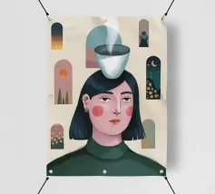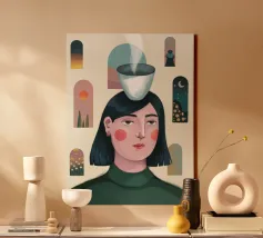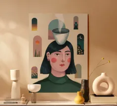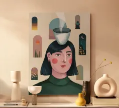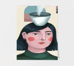 Questa opera d'arte ritrae una persona con una ciotola sulla testa, da cui fuoriesce fumo o vapore. Lo sfondo comprende varie forme geometriche e simboli che suggeriscono un senso di mistero e introspezione.