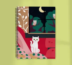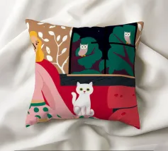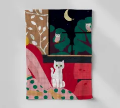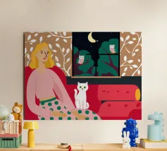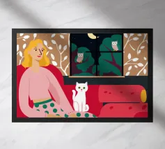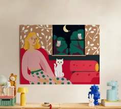 Una donna con un maglione rosa siede su un divano rosso con il suo gatto bianco, entrambi guardano fuori dalla finestra la luna crescente e le stelle, condividendo una notte tranquilla e contemplativa.