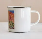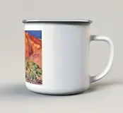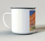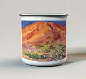 Una massiccia collina color cremisi domina il paesaggio, con i suoi contorni morbidi e fluidi resi con colori decisi contro un cielo pallido, catturando l'essenza monumentale e cotta dal sole di un ambiente desertico.