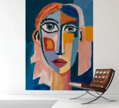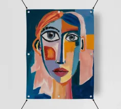 Quest'opera d'arte presenta una composizione astratta con colori vivaci e forme geometriche. Lo sfondo è un mix di tonalità blu, rosse e verdi, che creano un'opera suggestiva e dinamica.
