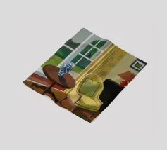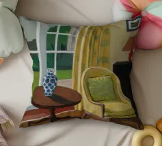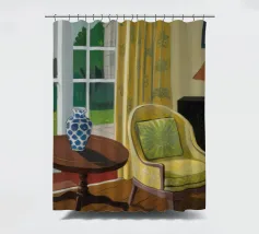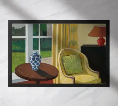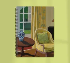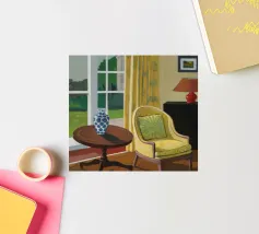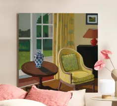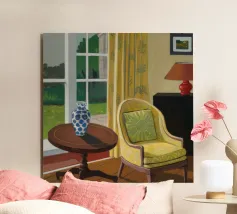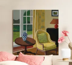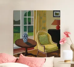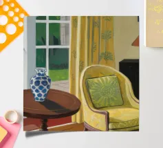 Una scena d'interni elegante e tradizionale con due poltrone, una verde e una gialla, posizionate per la conversazione. Un tavolo rotondo si trova tra loro vicino a una finestra, creando uno spazio classico, sofisticato e invitante.