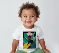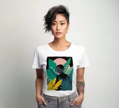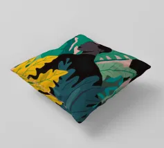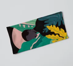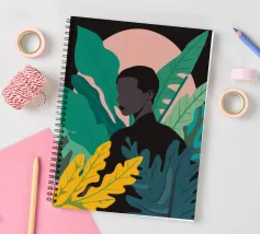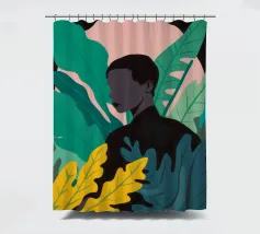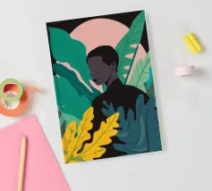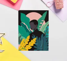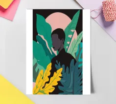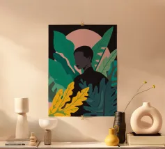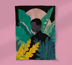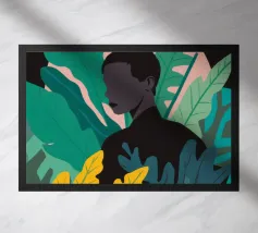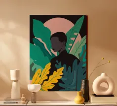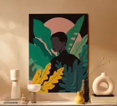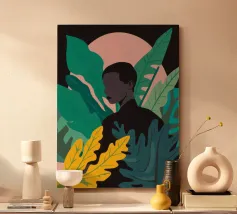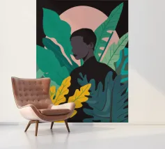 Ritratto di una coppia abbracciata in mezzo a una giungla lussureggiante di foglie verdi e un fiore rosa. La composizione è intima, tenera e fonde magnificamente un momento d'amore con la natura selvaggia.