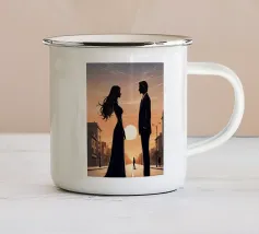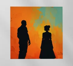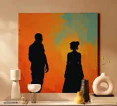 Un uomo e una donna si fronteggiano in silhouette, circondati da calde tonalità arancioni e gialle che creano un'atmosfera romantica. La loro postura suggerisce un legame e un'emozione.