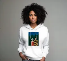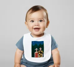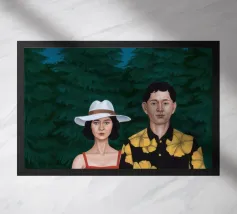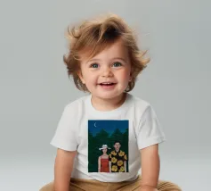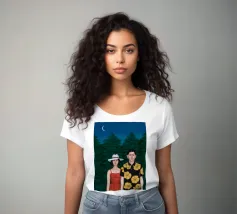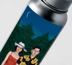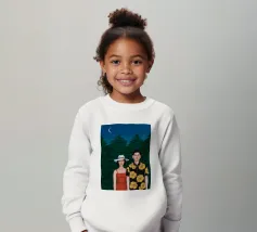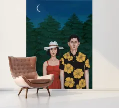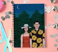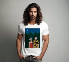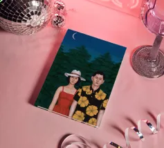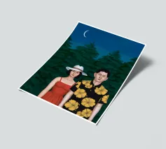 Illustrazione di una coppia seduta insieme sotto un albero in una notte di luna. La scena è una rappresentazione serena, romantica e pacifica di un momento tranquillo e intimo nella natura.