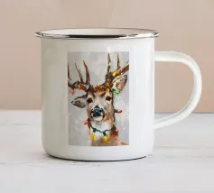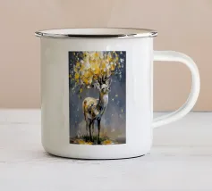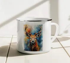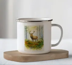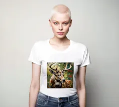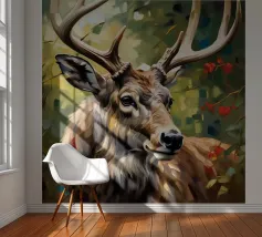 Le corna sono grandi e ramificate, ricoperte da una superficie ruvida e strutturata che cattura la luce tra gli alberi. Ogni dente si incurva naturalmente, mostrando la forza e la maturità dell'animale. Gli occhi attenti del cervo e la sua postura in bilico riflettono sia la dolcezza che l'istinto selvaggio, mentre le corna aggiungono un senso di regalità e potenza al suo aspetto complessivo.