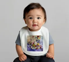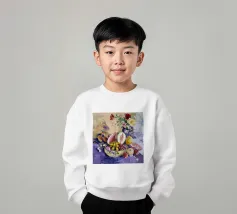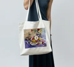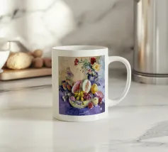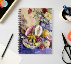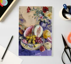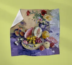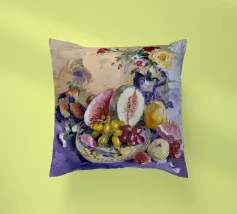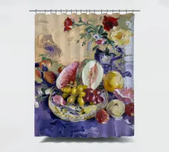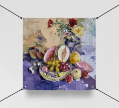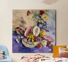 Una sontuosa natura morta con un'ampia gamma di frutti colorati, tra cui melone, uva e melograni, disposti con fiori e un piatto decorativo. Le texture ricche, i colori vivaci e la composizione classica creano un senso di abbondanza esotica.