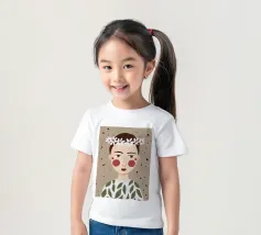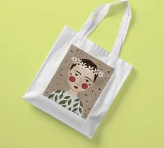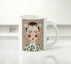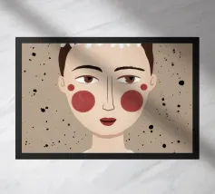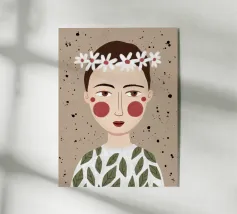 Delicato ritratto di una persona dai corti capelli castani che indossa una corona di margherite bianche. Lo sfondo è di un morbido beige maculato, che conferisce all'opera un'atmosfera rustica e tenera.