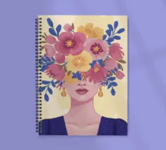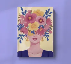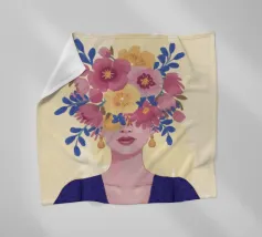 Questo dipinto presenta una figura con una corona di fiori colorati. Lo sfondo è di un giallo tenue e i fiori creano un'atmosfera vibrante e allegra.