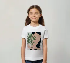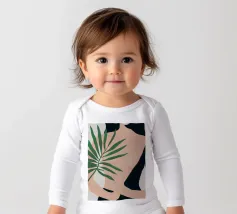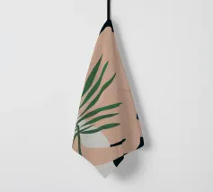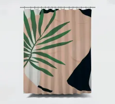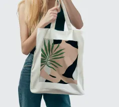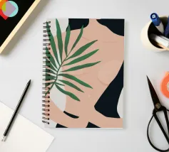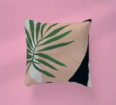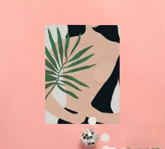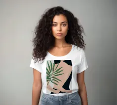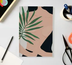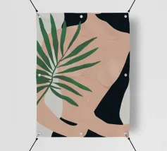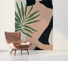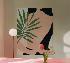 Illustrazione minimalista di una donna di schiena e di profilo, con le sue forme parzialmente oscurate da una grande foglia di palma verde. Lo stile è elegante, sereno e moderno.