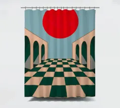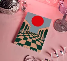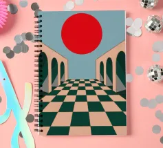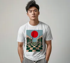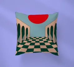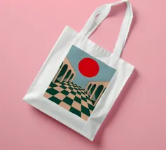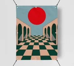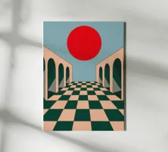 Illustrazione surreale e minimalista di un lungo corridoio con pavimento a scacchi e archi, che conduce verso un grande sole rosso. La composizione è un'opera architettonica potente, moderna e onirica.