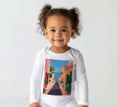 Illustrazione di una stretta strada acciottolata di una colorata città mediterranea, fiancheggiata da cactus in vaso e altre piante, che conduce verso il mare blu.