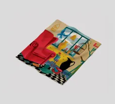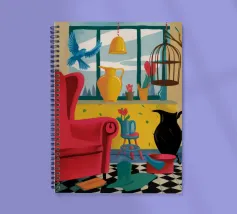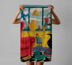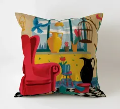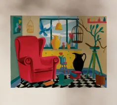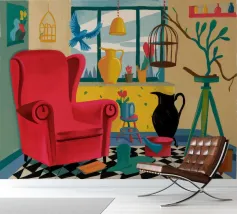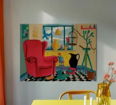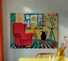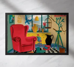 Una surreale scena d'interni con un grande corvo nero accanto a una gabbia per uccelli vuota e a una poltrona rossa. La composizione è misteriosa e simbolica, con la vista di un cielo blu brillante attraverso la finestra che crea un netto contrasto.