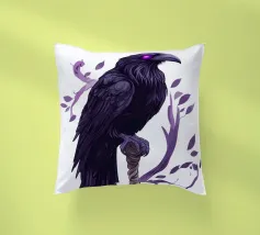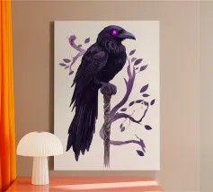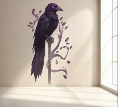 Questa accattivante opera d'arte raffigura un corvo nero come il vento, con gli occhi viola che brillano, appollaiato maestosamente su un ramo ornato e danneggiato dalle intemperie. La combinazione di colori surreale e i viticci organici e astratti sullo sfondo conferiscono al motivo un'atmosfera misteriosa e magica. L'uccello sembra un guardiano di una leggenda oscura o un animale totem spirituale di un altro mondo. Ideale per gli amanti del simbolismo mistico, dell'estetica fantasy o dei motivi della natura oscura. Sia in salotto che nello studio o nello studio creativo.