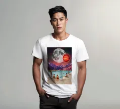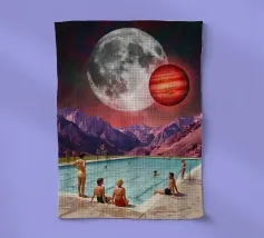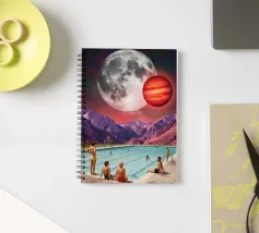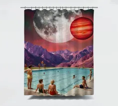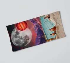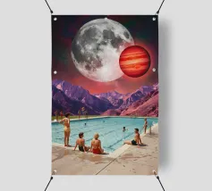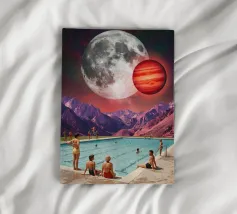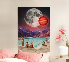 Un surreale paesaggio da sogno retrò dove il tempo libero incontra il cosmo. Questa opera d'arte mostra una piscina in stile vintage incastonata tra montagne spettacolari, mentre due corpi celesti - una luna luminosa e un pianeta simile a Giove - dominano il colorato cielo cosmico. L'estetica nostalgica di metà secolo si fonde perfettamente con la fantasia futuristica, evocando temi di fuga, meraviglia e realtà alternative. I colori ricchi, la composizione cinematografica e i dettagli giocosi rendono questo pezzo perfetto per gli interni moderni, gli spazi creativi e gli amanti dell'arte da parete surreale di ispirazione spaziale con un tocco retrò.